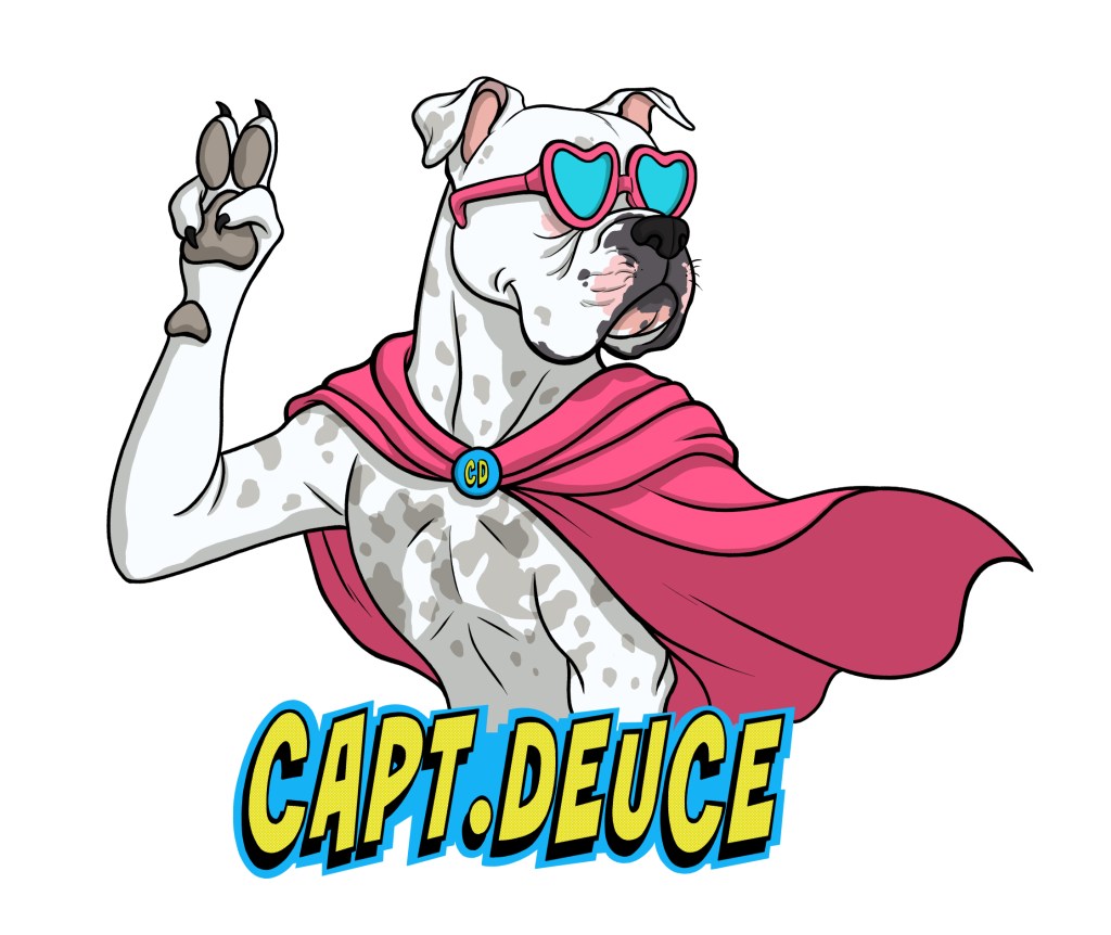 “Capt. Deuce”. I was commissioned to create a comic book-style logo for a client, featuring her recently deceased dog as a superhero. It was an enjoyable, emotive and fun project to work on!