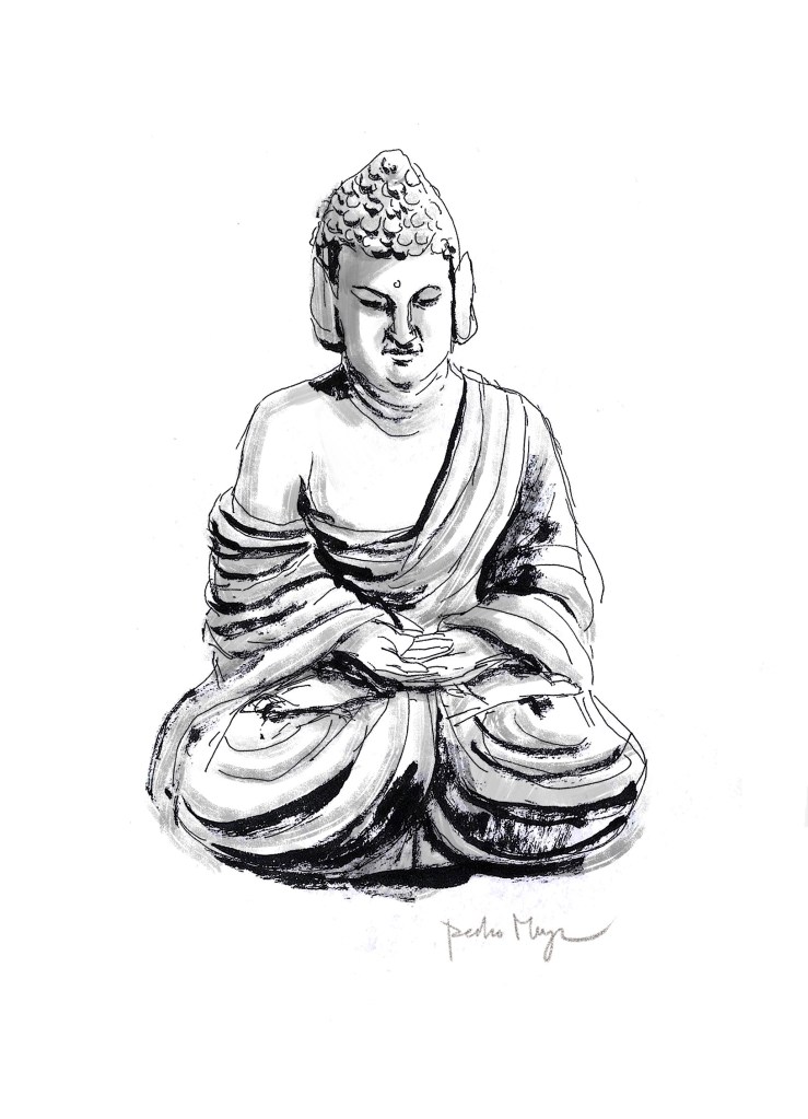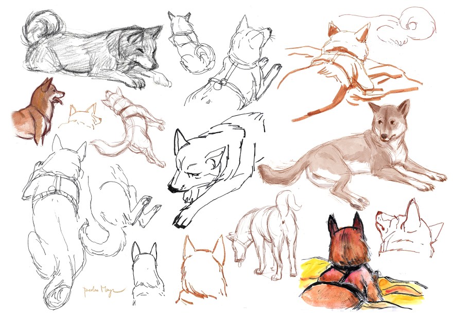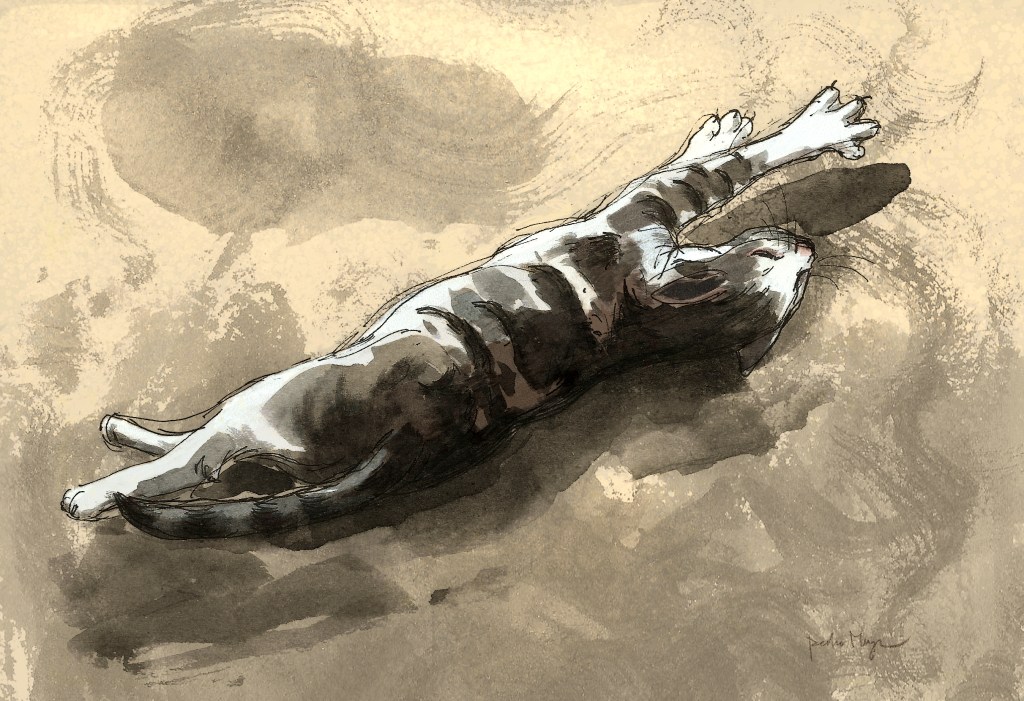 Cat stretching, sketch . A street cat is stretching in the sketch, waking up from its siesta. This is a great chance to experiment with traditional brush and ink, and then add digital color to reflect the ambience, mood, and time of the day.